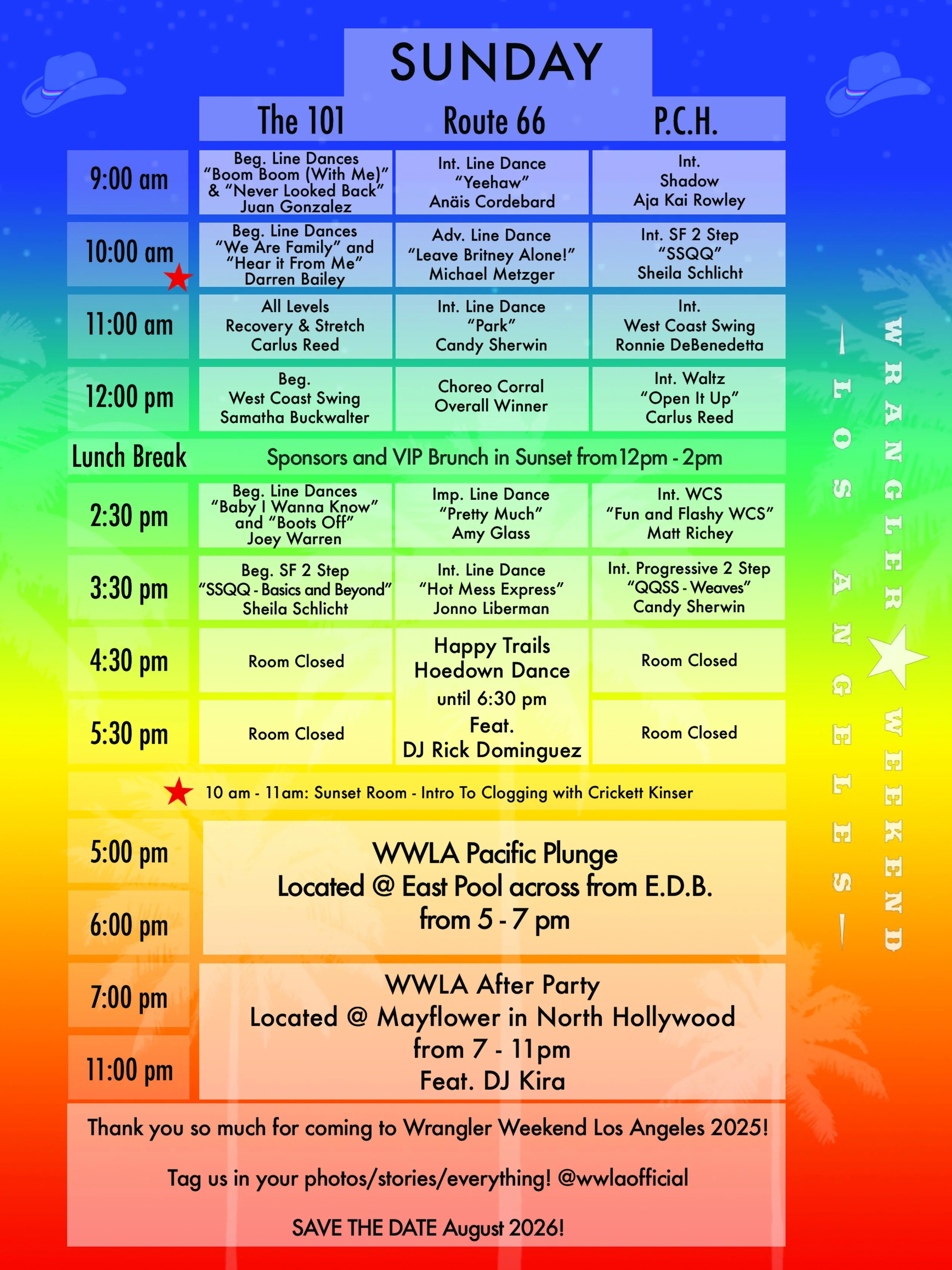 During our evening themed dances, our DJs will follow a recommended outline of four partner dances followed by three line dances. Each partner set will feature Two Step and WCS/Shadow with the other songs being rotated between Lindy (ECS), Waltz, Night Club, etc. Line dance sets will include classics and current favorites. Evening Dances have historically included the ‘Boots, Briefs, & Bras’, ‘Rainbow Party’, ‘Wrangler Rhinestone Ball’, and ‘Happy Trails Hoedown’.