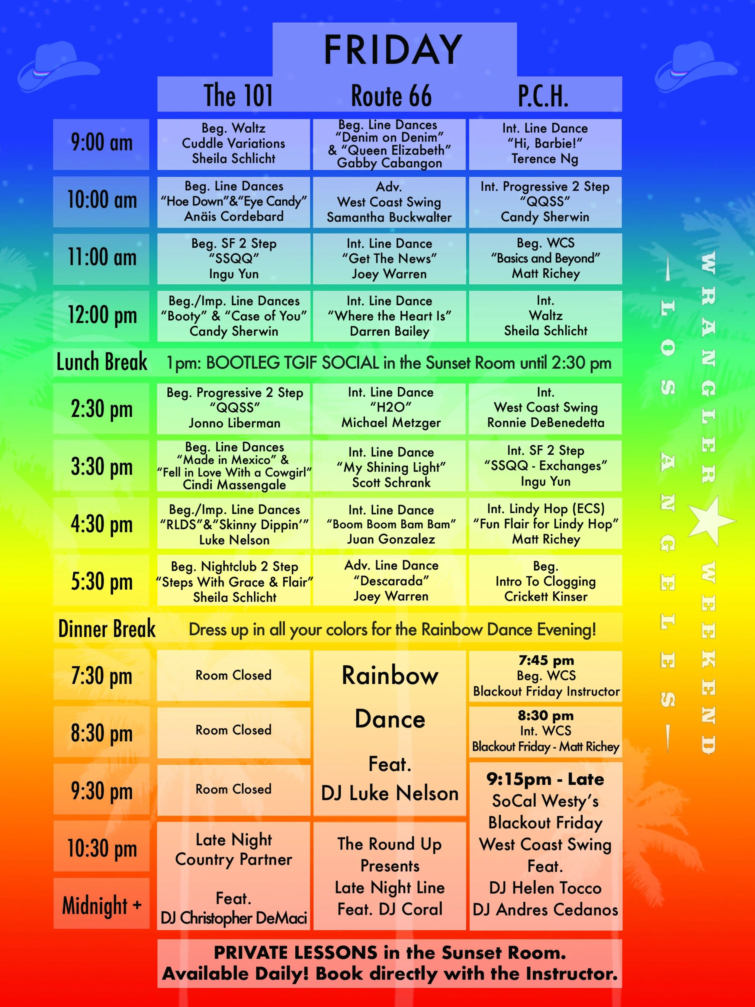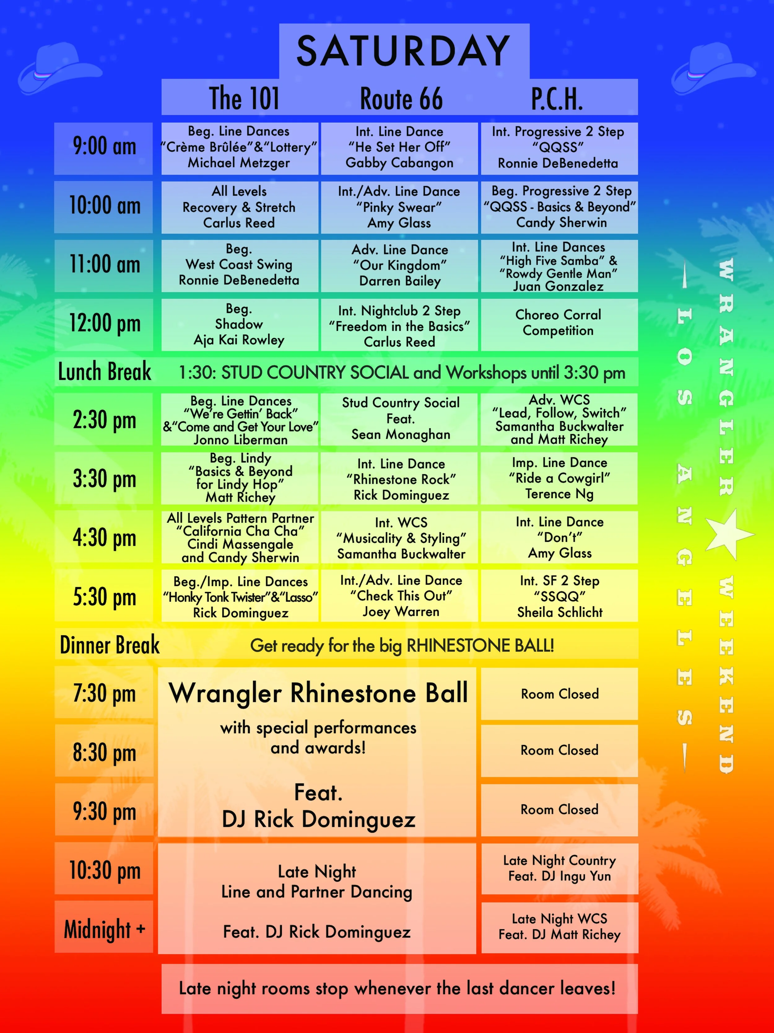 We have previously had three ballrooms dedicated to different styles of dancing starting at 10:00p on Friday (9:30p for SoCal Westy), and 10:30p on Saturday.  All three ballrooms will feature floors of over 2,000 square feet.